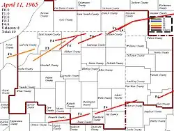 - ^ a b c d e f g h Blake Naftel; Jon Chamberlain; Becky Monroe; Ed Lacey Jr.; Dick Loney (2015). "April 11th 1965 Palm Sunday Tornado Outbreak". Northern Indiana Weather Forecast Office. Syracuse, Indiana: National Weather Service. Archived from the original on April 4, 2015. Retrieved December 14, 2020.