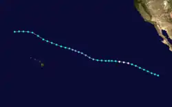 On the evening of August 2, a tropical storm formed south of Mexico, skipping tropical depression strength. It initially went west-northwest until the evening of August 4 when it reached Category 1 hurricane status. Blanca eventually leveled off as it headed westward. On the morning of August 7, Blanca weakened into a tropical depression after weakening into a tropical storm two days later. During the afternoon of that day, Blanca crossed into the Central Pacific as a 30-mile per hour tropical depression. Blanca regained tropical storm status on August 9 as it went northwestward. Blanca continued stair-stepping as it dissipated on August 12 while northwest of Honolulu, Hawaii. As Blanca never affected land, there were no reports of damages or deaths. Blanca set a record for the farthest traveling storm that formed in the Eastern Pacific by traveling 4,300 miles during its life. (1957's Hurricane/Typhoon Della traveled 5,000 miles, but formed in the Central Pacific.)[3]