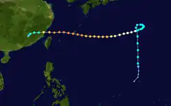 Mamie originated as a tropical disturbance over the western Philippine Sea around July 14. Initial tracking data showed a west-northwestward trajectory, with the system intensifying to a tropical storm by July 15 near the Luzon Strait. Mamie reached its peak intensity at 85 knots (155 km/h) early on July 17, equivalent to a Category 1 typhoon, with a central pressure of 987 hPa. This peak occurred just before landfall in Guangdong Province, China, on July 17. After landfall, Mamie degraded swiftly, and dissipated on July 18.