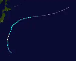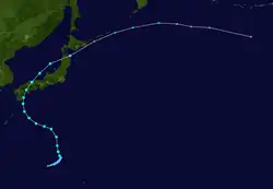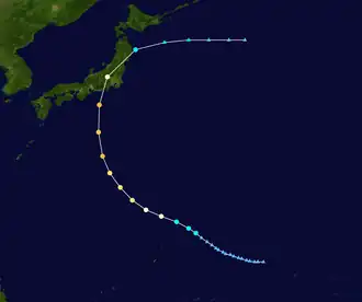 The incipient disturbance that became Super Typhoon Kit was first identified on June 20 near Chuuk State in the Federated States of Micronesia.[14] The JMA designated that system as a tropical depression that day as the system moved steadily westward.[15] The JTWC followed suit with this classification on June 22 following an investigation by reconnaissance. Early the next day, the depression acquired gale-force winds and was dubbed Tropical Storm Kit. Turning to the northwest, Kit developed a 35–55 km (22–34 mi) wide eye and reached typhoon status late on June 23.[14] Rapid intensification ensued late on June 24 into June 25; Kit's central pressure dropped 51 mbar (hPa; 1.5 inHg) in 18 hours from 965 mbar (hPa; 28.50 inHg) to 914 mbar (hPa; 26.99 inHg).[16] During this time, Kit's eye contracted to 13 to 17 km (8.1 to 10.6 mi).[14] At 06:00 UTC on June 26, the JMA estimated Kit's pressure to have abruptly dropped to 880 mbar (hPa; 25.99 inHg),[15] which would rank it among the top ten most intense tropical cyclones on record.[17] Around this time, the JTWC estimated Kit to have attained peak winds of 315 km/h (195 mph);[16][18] however, these winds are likely an overestimate.[1] A later reconnaissance mission on June 26 reported a pressure of 912 mbar (hPa; 26.93 inHg), the lowest observed in relation to the typhoon.[14] Weakening ensued thereafter as the system accelerated to the north-northeast. Retaining typhoon strength, Kit brushed southeastern Honshu, Japan, on June 28, passing roughly 155 km (96 mi) east of Tokyo. The system subsequently weakened to a tropical storm and transitioned into an extratropical cyclone south of Hokkaido on June 29.[16] The National Oceanic and Atmospheric Administration reported the remnants of Kit to have dissipated the following day near northeastern Hokkaido.[19] However, the JMA states that the system turned eastward and accelerated over the north Pacific before losing its identity on July 3 near the International Date Line.[15]