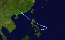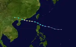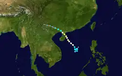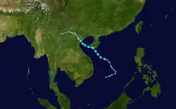 A tropical depression formed near the Eastern Visayas on July 8 and tracked west-northwest. After crossing Luzon on July 11, the system emerged over the South China Sea and began strengthening.[26] Reaching tropical storm intensity on July 12, Lola tracked northwest toward Hong Kong. The system attained its peak intensity the following day with winds of 110 km/h (70 mph) and a pressure of 992 mbar (992 hPa; 29.3 inHg).[27][28] Lola subsequently made landfall near Hong Kong,[26] where it killed one person,[29] before rapidly dissipating over Guangzhou on July 14.[27]