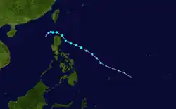 115 mph Typhoon Irma hit the eastern Samar on May 15. It weakened over the island, but re-intensified rapidly to a 140 mph typhoon in the Sibuyan Sea before hitting Mindoro on the 17th. After weakening to a tropical storm, Irma turned northward to hit western Luzon as a 95 mph typhoon on the 19th. It accelerated to the northeast, and became extratropical on the 22nd. The extratropical remnant raced northeast before abruptly slowing on May 23 well to the east of Japan. During that time, it temporarily turned north while moving erratically. The system later acquired a general eastward track by May 26 and accelerated once more before dissipating near the International Date Line on May 29.[3]