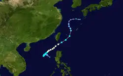 - ^ This system is considered a tropical storm with peak winds of 75 km/h (45 mph) and a minimum pressure of 997 mbar (hPa; 29.44 inHg) by the China Meteorological Agency, Hong Kong Observatory, and Japan Meteorological Agency.[73]