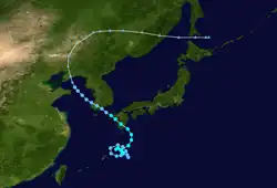 A low-pressure system formed in the western Pacific on August 21. Initially drifting west-northwest, the system slowly developed and intensified to tropical storm status by August 28. It was named Betty. Betty reached peak intensity on August 30. Betty then turned northeastward, and made landfall near Yeosu, South Korea, on August 30 as a tropical storm. It later transitioned to an extratropical cyclone on September 1 and dissipated on September 4. No significant damage or casualties were documented, attributed to its moderate strength and landfall in less populated regions.