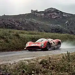 The 50th anniversary edition of the Targa was marred by an inclement weather that turned the road into a quagmire. The winners of the 1965 edition, Nino Vaccarella and Lorenzo Bandini started as favorites driving the powerful, prototype-class Ferrari 330 P3.[1] Indeed it seemed they could led Ferrari to another victory but two laps from the end, a wrong maneuver by Bandini while lapping a slower car resulted in the 330 off the road. This paved the way of the victory for the factory-backed Scuderia Filipinetti Porsche 906 of Herbert Müller and Willy Mairesse, followed by the Dino 206 S of Guichet/Baghetti, and another 906 of Sicilian duo Pucci/Arena.[1]