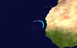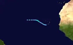 A convectively active tropical wave moved off the western coast of Africa on September 22. It tracked westward, remaining disorganized until September 25, when it developed into a tropical depression around 00:00 UTC. The small system harbored organized convection over its center, which was the basis for upgrading it to a tropical storm on September 27. The next day, it reached peak winds of 45 mph (72 km/h). By September 30, the storm began to become less organized while it slowed in forward motion, a trend that caused the cyclone to dissipate after 12:00 UTC on October 1.[3]