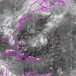 A tropical wave moved through the northeastern Caribbean on October 10, with a large area of associated thunderstorms. The wave interacted with a stalled frontal boundary, developing a broad circulation by October 13 to the northeast of the Bahamas. A day later, the system developed into a subtropical storm – its classification was because the system was co-located with a trough. There was another area of convection along the front northeast of the subtropical storm, which accelerated northeastward. Meanwhile, the subtropical storm turned westward. It had a small circulation with thunderstorms sheared north of the center, which gradually became more organized. On October 17, an approaching front turned the storm northward and later northeastward. On the same day, the subtropical storm transitioned into a tropical cyclone. On the next day, the storm attained peak winds of 60 mph (97 km/h), before it transitioned into an extratropical cyclone over Atlantic Canada, where it was ultimately absorbed by the cold front on October 19.[3]