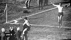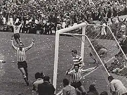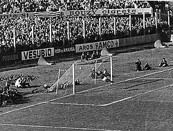 Racing Club began to take advantage as Celtic's composure and discipline disintegrated. On 48 minutes, Johnstone on being held back by Rulli, lashed out at the Argentinian in frustration and was duly sent off.[28] Six minutes later, Racing Club took the lead when Cárdenas scored from 25 yards out with a superb left-footed shot into goalkeeper Fallon's top left corner.[12][28] Celtic were reduced further in numbers after 74 minutes when John Hughes was sent off for kicking Cejas as he lay on the ground.[28] Shortly afterwards Rulli was sent off for punching Celtic's John Clark.[29] Two minutes from time, another melee erupted between the sides, resulting once again in the intervention of the Uruguayan riot police.[28] Bertie Auld was sent off, but refused to leave the field and eventually played the full match. He was however reported by the referee afterwards.[28][31] Whilst Auld refused to leave the field, amidst the total chaos on the field Tommy Gemmell kicked one of the Racing Club players in his genitals, which went unnoticed by the referee.[32] The game finished 1–0 to Racing Club, clinching the trophy for the South American champions and making them the first Argentinian holders of the Intercontinental Cup.[25][33] In total, 30 fouls were given against Celtic and 21 against Racing Club.[25] Most fouls however went unnoticed or were not called by the referee.