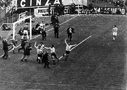 When the game finally began, Racing Club abandoned their defensive play of the first leg and pressed forward for an early goal. João Cardoso forced a save from John Fallon. Celtic attacked too, and Johnstone headed the ball into the goal only for it to be ruled offside. Celtic took the lead in 22 minutes after Johnstone was brought down in the penalty box by goalkeeper Cejas. Tommy Gemmell took the penalty kick and scored, despite the efforts of a dozen Argentinian press photographers who had encroached onto the pitch and were gesticulating at him in an effort to distract him.[21] Racing Club rallied however, and equalised on 34 minutes with a finely taken goal; Norberto Raffo looping a header past Fallon from a Maschio cross.[22]
