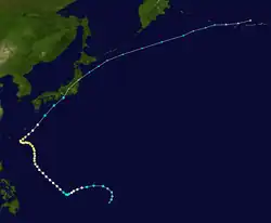 Typhoon Dot formed in the western Pacific on July 19 near the Mariana Islands. Initially classified as a tropical depression, it intensified into a tropical storm by July 20, moving west-northwest. Its path soon diverged from typical storms: Dot executed a rare counterclockwise loop east of the Bonin Islands (Iwo Jima) on July 21–22.