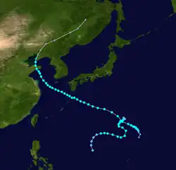 After recurving, Georgia traversed the open Pacific north of 30°N. By August 4, it weakened to a tropical depression, with winds dropping below 35 knots. The system transitioned into an extratropical cyclone by August 8, ultimately dissipating near the Kuril Islands on August 13.