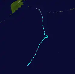 A tropical depression formed in the western Pacific on July 27. Over the next 48 hours, it tracked west-northwestward, intensifying into a tropical storm by July 29. This early phase featured steady organization, with central pressure dropping to 989 hPa by July 30. Georgia reached its peak intensity on August 1–2, with maximum sustained winds of 60 knots (110 km/h) and a central pressure of 982 hPa. The storm then executed a gradual northeastward recurvature east of the Bonin Islands. By August 2, it accelerated toward higher latitudes, maintaining tropical storm strength.