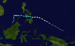 Therese emerged in the western Pacific on March 15 near the Caroline Islands as a tropical depression. Within 24 hours, it intensified into a tropical storm, moving steadily west-northwestward through the Philippine Sea. By March 18, Therese reached its peak intensity with sustained winds of 110 km/h (70 mph) and a central pressure of 990 hPa, classifying it as a "severe tropical storm" per the Japan Meteorological Agency (JMA).[2]
