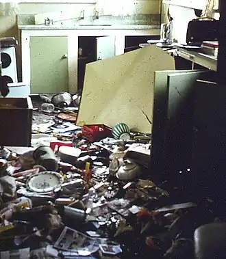 At Whitecliffs, a limestone bluff collapsed onto a farmhouse owned by Mr Frederick John Jackson and pushed it downhill, killing Mrs Rona Mildred Jackson instantly and fatally injuring her visiting mother, Mrs Fanny Elizabeth Blackmore of Christchurch.[6] Shortly after the earthquake, one man died near Greymouth when his car hit a subsided section of road on the run-up to a bridge.[2] An additional three men were killed on 29 May when a Bell 47G-2A helicopter, piloted by Gordon Hutchings, carrying two Post Office linesmen, Robert Pedder and Edwin Steer, from Murchison to Lyell, hit power lines and crashed shortly after take-off.[7][8]