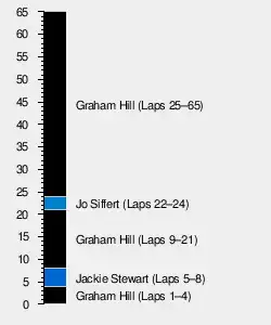 Hulme started with a mathematical chance of becoming world champion, but his McLaren broke a rear suspension member early, crashed, and caught fire.[1] Jo Siffert took the lead, but had to pit with a broken throttle cable. Stewart fell back when his engine started to misfire, his car's handling began going off, and had a fuel-feed problem. Hill won this race and his second Drivers' Championship, after Stewart fell back to seventh after an engine problem with his Matra.[2]