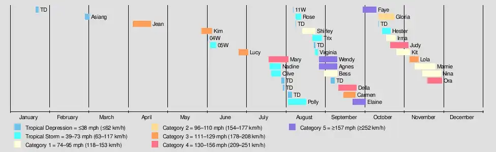 31 tropical depressions formed this year in the Western Pacific, of which 27 became tropical storms. 20 storms reached typhoon intensity, of which 4 reached super typhoon strength. No storms this season caused significant damage or deaths.