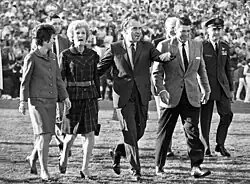 A number of celebrities were present, including President-elect Richard Nixon, Bob Hope, California Governor and future United States President Ronald Reagan and his wife Nancy Reagan, and former Oklahoma head coach and then-ABC analyst Bud Wilkinson.[16] First Lady Pat Nixon was a graduate of USC, but President Nixon spent time on both sidelines.[16] Richard Nixon called the Rose Bowl Game, "the prize game of all bowl games."[16]