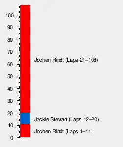 As they had many times during the season, Rindt and Stewart quickly separated themselves from the rest of the field. On lap 12, Rindt slid wide and allowed Stewart through. The Matra's engine was not running at full strength, however, and it was all Stewart could do to hold off the Austrian, who was bobbing and weaving on both sides, trying to get by. Rindt finally got past on the straight on lap 21, and eventually, the Scot began to fall back.