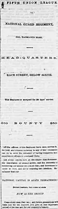 The regiment was organized at Camp Cadwalader near Philadelphia on 20 July 1864, under the command of printer and Volunteer officer Colonel Harmanus Neff;[1] it had a total enrollment of 958.[2] It was alternately known as the 5th Union League Regiment due to its being organized with the assistance of the Union League of Philadelphia. A week after its organization, on 27 July, the 196th Pennsylvania was sent to Camp Bradford at Mankin's Woods near Baltimore, attached to the 3rd Separate Brigade of VIII Corps. From there, it entrained for Chicago in mid-August, where it guarded Confederate prisoners of war at Camp Douglas. Company H was detached to perform provost duty at Springfield, Illinois on 26 August, and remained there until the end of its term. The regiment helped foil an escape on the night of 27 September by firing at outside sympathizers who had mobilized to facilitate the attempt.[3] In early November, the regiment was sent back to Philadelphia, and left for brief service at Fort Delaware on 5 November.[4] It was mustered out at Philadelphia on 17 November,[5] having lost ten men to disease during its service.[6]