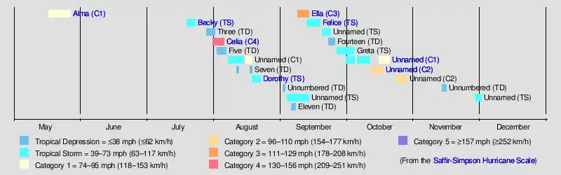 Tropical cyclogenesis began in May, with Alma developing on May 17. No tropical cyclone activity occurred in June. Three systems originated in July, including Tropical Storm Becky and the depression that would eventually intensify into Hurricane Celia, as well as another tropical depression that remained below tropical storm intensity. Celia became the most intense tropical cyclone of the season on August 3, peaking as a Category 3 hurricane on the Saffir–Simpson scale with maximum sustained winds of 140 mph (220 km/h) and a minimum barometric pressure of 944 mbar (27.88 inHg).[3] In August, four tropical systems developed, including two tropical depressions, an unnamed hurricane, and Dorothy. September eight featured tropical depressions, though only three became named storms – Ella, Felice, and Greta.[6] October featured two unnamed hurricanes. Two more systems, a tropical depression and an unnamed tropical storm, developed in November, the latter of which transitioned into an extratropical cyclone on December 1, ending the season's activity.[3]