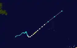 On October 12, a subtropical depression developed while located northeast of the Bahamas. It steadily intensified and became a subtropical storm by the following day. After tracking east-northeastward, the storm made a sharp westward turned, followed by a curve to the north-northeast. After fully acquiring tropical characteristics, the subtropical storm transitioned into a tropical cyclone early on October 16. Twelve hours later, the storm strengthened into a hurricane,[3] shortly before passing near Bermuda.[51] It continued to intensify and briefly became a Category 2 hurricane on October 17. The hurricane then accelerated rapidly northeastward,[3] and made landfall on the Avalon Peninsula of Newfoundland as a Category 1 hurricane. Shortly thereafter, the hurricane transitioned into an extratropical cyclone on October 17.[3][52]