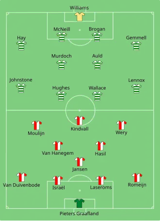 In the second half, Celtic managed to hold on at 1–1 to force extra time.[2] With just a few minutes of extra-time remaining, a long free-kick from the Feyenoord half was sent towards the Celtic penalty area. Celtic defender and captain Billy McNeill stumbled and misjudged the ball, and as he tried to recover he appeared to punch the ball away. Before the referee had a chance to award a penalty, Ove Kindvall reacted quickly, running on and chipping the ball over the advancing goalkeeper Evan Williams to seal a 2–1 win for Feyenoord.[3][4]