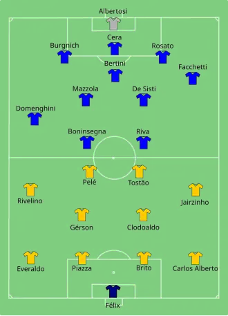 Brazil struck first, with Pelé heading in a cross by Rivellino at the 18th minute.[4] Roberto Boninsegna equalized for Italy after a blunder in the Brazilian defence. In the second half, Brazil's firepower and creativity was too much for an Italian side that clung to their cautious defensive system. Gérson fired in a powerful shot for the second goal, and then helped provide the third, with a long free kick to Pelé who headed down into the path of the onrushing Jairzinho. Pelé capped his superb performance by drawing the Italian defence in the centre and feeding captain Carlos Alberto on the right flank for the final score. Carlos Alberto's goal, after a series of moves by the Brazilian team from the left to the centre, is considered one of the greatest goals ever scored in the history of the tournament.[5]