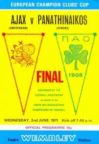 The 1971 European Cup final was a football match played on 2 June 1971 at Wembley Stadium between Dutch side Ajax and Greek side Panathinaikos, to determine the champions of the 1970–71 European Cup. Ajax were appearing in their second final, having lost the 1969 final to Italian club AC Milan; Panathinaikos were appearing in their first.