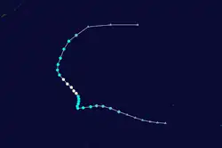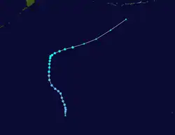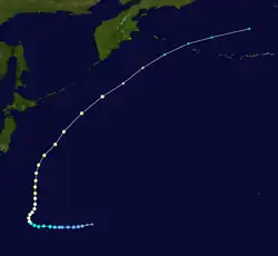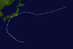 During January 8, the JMA started to monitor a tropical depression that had developed, about 500 km (310 mi) to the east of Ngerulmud, Palau.[3] Over the next day the system gradually developed further as it moved north-westwards, before it was classified as a tropical storm and named Sarah by the JTWC, after a US Navy plane had found an organised system.[3][4] The system subsequently recurved north-eastwards, before it was classified as a Severe Tropical Storm by the JMA during January 10.[5] During that day, the JTWC reported that the system had peaked, with 1-minute sustained wind-speeds of 95 km/h (60 mph).[4] Over the next day, the system quickly weakened and became an extratropical cyclone during January 11.[4] Sarah's extratropical remnants were subsequently tracked as they moved north-eastwards, until it made landfall on Canada and broke up over the mountains of British Columbia during January 17.[4]