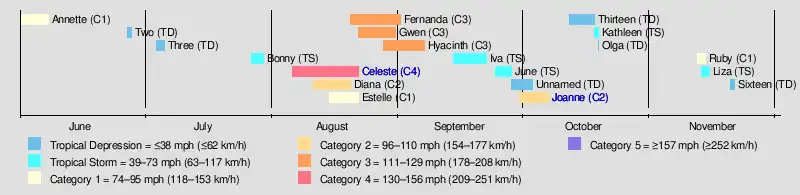 Of this season's fourteen named tropical cyclones, twelve formed in the eastern Pacific and two in the central. Both central Pacific tropical cyclones were tropical storms. Of the eastern Pacific systems, four were tropical storms and eight were hurricanes. Of those eight hurricanes, four were major hurricanes because they peaked as Category 3 or higher on the Saffir–Simpson hurricane scale.[1] Although these totals are below the modern long-term averages of fifteen named storms, nine hurricanes, and four major hurricanes,[2] At the time, 1972 was the central north Pacific's busiest known season.[3]