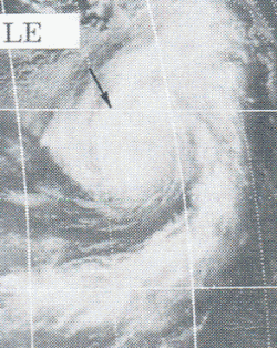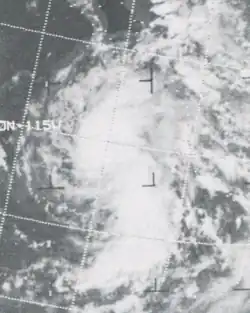 On October 16, the northern hemisphere component of a "cyclone twin" was classified by JTWC as a tropical depression while located near 7.0°N 179°W, just within the central Pacific basin.[5][16] After crossing the International Date Line, it intensified into Tropical Storm Olga of the 1972 Pacific typhoon season. After passing through the Marshalls as a tropical storm, Olga intensified into a typhoon on October 25. It then swung through part of the Northern Marianas Islands before it was absorbed by a front near Honshū on October 29. As the NMI had already been hit by Typhoon Marie three weeks earlier, little damage was reported.[5]