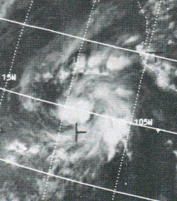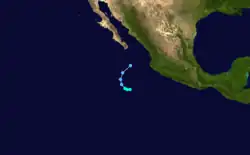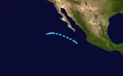 On October 18, a vortex in the Intertropical Convergence Zone was determined to be a tropical storm through the use of satellite pictures.[4] Kathleen was a tropical storm for only eighteen hours before weakening into a tropical depression and recurving to the northeast.[1] The tropical cyclone dissipated on October 19 while out to sea west of Puerto Vallarta. No deaths or damages were reported.[4]