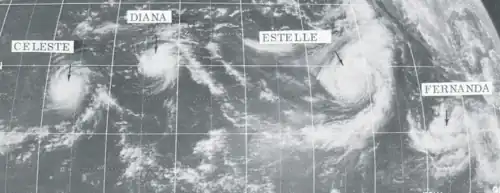 On August 11, a tropical storm formed. It headed to the west northwest and strengthened into a hurricane on August 12. Diana then turned to the northwest, and peaked in intensity on August 1. It then headed west, and crossed into the central Pacific as a Category 1 hurricane.[4] Shortly after crossing the basin boundary on a path directly towards the Hawaiian Islands, Diana weakened into a tropical storm. On August 18, Diana turned to the northwest. It dissipated two days later.[5]