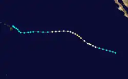 On August 6, a tropical disturbance developed into a tropical storm, skipping the depression stage. It edged south until August 8. At that point, it turned to the west. It would continue in that general direction until it dissipated. Celeste intensified into a hurricane on August 10. It then left the Eastern Pacific Hurricane Center's area of responsibility and entered the central Pacific.[4] Celeste continued intensifying and eventually peaked as a Category 4 hurricane on the Saffir–Simpson hurricane scale. Celeste's Category 4 winds and central pressure of 940 millibars (940 hPa) made it the most intense cyclone of the season. After that, Celeste steadily weakened.[1] After turning north, it dissipated on August 22 due to wind shear.[5]