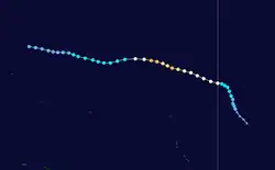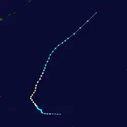 A tropical disturbance generated by an upper tropospheric low in the mid-Pacific trough moved westward through the Caroline Islands, slowly organizing into Tropical Depression 1W on January 5. The depression quickly strengthened, reaching tropical storm status later that day and becoming a typhoon on the 6th as it neared the Philippines. Kit rapidly intensified on the 6th and 7th to a 140 mph (230 km/h) typhoon, the strongest ever in January, but its inflow was cut off to the west, weakening the typhoon as it continued westward. Kit hit the eastern Philippines as a 100 mph (200 km/h) typhoon on January 7, and turned north through the archipelago in response to a break in the subtropical ridge. This brought Kit eastward then southward, where after completing its large loop it dissipated on January 15, just 170 nautical miles (310 km) from its starting location.[2]