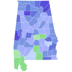 | Cullman | 12,009 | 61.02% | 7,601 | 38.62% | 17 | 0.09% | 28 | 0.14% | 27 | 0.14% | 4,408 | 22.40% | 19,682 |