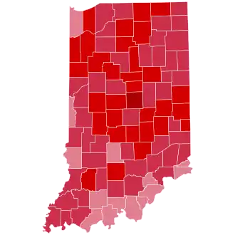 Nixon carried Indiana with 66.11% of the vote to McGovern's 33.34%, a victory margin of 32.77% as well as the best Republican performance in Indiana history. Although Indiana is one of the most reliable Republican states in the country, this is the only occasion where a Republican candidate (indeed, where any Presidential candidate) carried every county in the state.[1] As of the 2024 presidential election, this is the last time a Republican won Democratic-leaning Lake County in the northwestern corner of the state.[2]