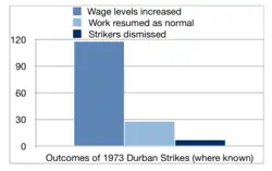 The 1973 Durban strikes which were part of the wider Durban Moment, were a series of labour disputes and worker-led demonstrations held in Durban in 1973.[1] African workers across various sectors deliberately withheld their labour in an attempt to demand higher wages and better working conditions.[1][2] Beginning on 9 January 1973, mass strikes broke out in Durban and continued for three months until the end of March.[3][1] The strikes involved roughly 60 000 African workers and impacted more than 100 firms.[4] The highest number of strikes occurred on the outskirts of Durban in textile, metal and chemical plants.[2] Although the number of strikes declined after March, 100 000 African and Indian workers were reported to have taken some form of industrial action by the end of 1973.[2]