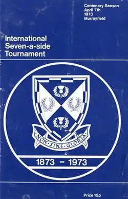 The 1973 International Seven-a-side tournament was the first rugby sevens tournament to feature national representative teams,[1] predating the first official Rugby World Cup Sevens by twenty years. Held in Scotland as part of the Scottish Rugby Union's centenary celebrations, the tournament featured players from all eight of the members of the IRB. Although not sanctioned by the IRB as an official world cup the winners, England, were hailed by the press as the world seven-a-side champions.[2]