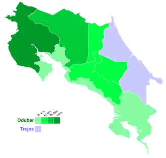 | Province | Oduber % | Trejos % | González % | Carazo % | Villalobos % | Mora % | Monge % | Aguilar % |