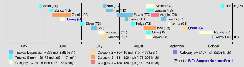 | Connie | June 7 – 22 | Category 3 hurricane | 125 (205) | 942 | None | None | 0 | |||