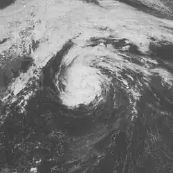 Doris made meteorological history when, on August 31, it became the first Atlantic hurricane ever to be upgraded to hurricane intensity solely on the basis of satellite pictures,[1] via the Dvorak technique.[7] The cyclone then curved northward and intensified further during the next few days, becoming a Category 2 hurricane early on September 2.[3] Based on the Dvorak technique, it is estimated that Doris peaked with maximum sustained winds of 110 mph (180 km/h) and a minimum barometric pressure of 965 mbar (28.5 inHg) shortly thereafter. By September 3, the hurricane began interacting with a non-tropical low pressure area.[7] On the following day, Doris quickly weakened to a tropical storm and transitioned into an extratropical cyclone about 830 mi (1,340 km) south-southeast of Cape Race, Newfoundland, around 06:00 UTC. The extratropical remnants weakened and then dissipated late on September 4.[3]