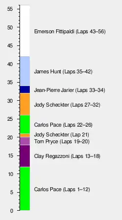 From the start – in which a lights system was being used for the first time in any Grand Prix, replacing the traditional national flag – Carlos Pace led from Pryce.