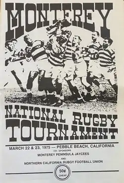 The 1975 Monterey National Rugby Championship was the 17th edition of the tournament and was considered to be the de facto national championship.[ 17] [ 18] [ 19] [ 20] [ 21] [ 22] [ 23] [ 24] This event took place at Pebble Beach, CA from March 22–23. The tournament MVP was Mike Hodgins (Cal Berkeley), Most Valuable Fan was 86 year old Watson Luke, Steve Montgomery of the Old Blues won the Drop Kick competition while Mickey Ording of X–Os was runner-up.[ 25] UCLA went 5–0 to take first place.[ 26] [ 27] [ 28] [ 29] [ 30] [ 31]