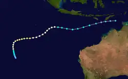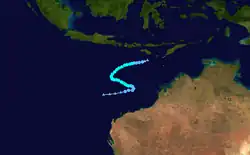 Cyclone Vern formed on 27 January from one of several low pressure centres within a trough that extended from the Cocos Islands eastward across northern Australia to Queensland. Over the period of a couple days, the strong northwesterly monsoonal flow to the north of the trough interacted with the strengthening easterly winds of a high-pressure area moving into the Great Australian Bight. As a result, one of the lows rapidly deepening into a tropical cyclone off the Kimberley coast. After initially moving tracking westward out to sea, the storm executed an anticyclonic loop and proceeded to move eastward. Then, early on 31 January, while located about 250 km (155 mi) northwest of Broome, Vern took a sharp turn toward the southeast then south. It continued in that general direction until it made landfall near Anna Plains at about 03:00 GMT, 1 February, with winds of about 145 km/h (90 mph). Inland, the system tracked southwestward then to the south again, causing flooding and minor damage, before dissipating on 3 February over the Pilbara.[1]