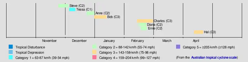 | Steve | November 24 – December 4 | Category 2 tropical cyclone | 110 km/h (70 mph) | 965 hPa (28.50 inHg) | ||||