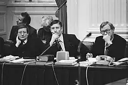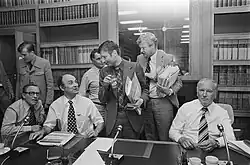 The division was not only substantive, but also arose from personal ambitions. Although Van Agt was easily elected as party leader at the first party meeting, the election of the deputy party leader exposed a tribal war. Andriessen was initially chosen over Aantjes, who reacted angrily. The minutes of this meeting were subsequently leaked, after which Van Agt persuaded Andriessen to withdraw in order to maintain unity. This time no election was called, meaning the vice-presidency fell to the number two on the list; Aantjes. CHU leader Roelof Kruisinga was mainly interested in a ministerial post and contacted PvdA members about this. Aantjes also had a lot of contact with the PvdA. Andriessen, on the other hand, had the most contact with Van Agt of the three.[14] CDA policy officer Joop van Rijswijk noted about the internal cooperation: "In fact, our parliamentary group has a four-person leadership. But this leadership collective [...] exhausts itself in eyeing each other and distrusting each other and in running under the feet of the party leader."[14]