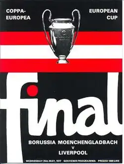 The 1977 European Cup final was an association football match played between Liverpool of England and Borussia Mönchengladbach of West Germany on 25 May 1977 at the Stadio Olimpico in Rome, Italy (the venue was decided in Bern by the UEFA Executive Committee on 17 September 1976).[1] The showpiece event was the final match of the 1976–77 season of Europe's premier cup competition, the European Cup. Both teams were appearing in their first European Cup final, although the two sides had previously met in the 1973 UEFA Cup final, which Liverpool won 3–2 on aggregate over two legs.