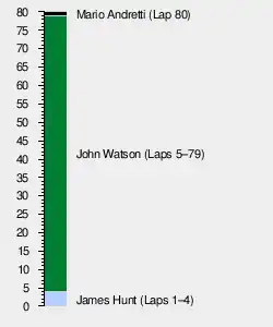 Once again it was Mario Andretti on pole with James Hunt second and Gunnar Nilsson third on the grid. Hunt got the best start and led into the first corner from John Watson and Jacques Laffite, with Andretti dropping down to fourth. However, Watson passed Hunt on the fifth lap and started to build a gap until Andretti got up to second and began to reel him in. During the final few laps, leader Watson and Andretti were running nose-to-tail but Watson held him off till the last lap when his engine missed a beat and immediately Andretti was past. Andretti thus took the win ahead of a crestfallen Watson and Hunt.