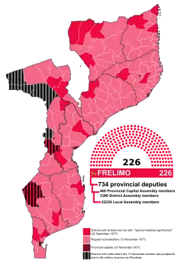 Direct elections were only held for local and city councils, starting on 25 September.[2] These councils then elected members of their local councils to the District Assemblies, which in turn elected representatives to the Provincial Assemblies. FRELIMO produced a single list of shortlisted candidates for the newly created 226-seat People's Assembly, the country's top legislative body. The candidate list was unanimously adopted by the Provincial Assemblies at their first session.[3][4]